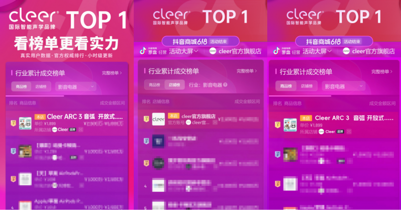 In April of this year, international intelligent acoustics brand Cleer launched its flagship product - Cleer ARC 3 Sound Arc Open AI Earphones. With its excellent master sound quality and powerful AI capabilities, this earphone has become a star product in the market in just three months, becoming a sought after object for major technology enthusiasts and music lovers. Especially during the 618 Shopping Festival, Cleer won the top 1 in the cumulative turnover list of the commodity list, store list, AV appliance list industry on the Tiktok platform with this headset, further consolidating its leadership in the field of open smart headphones.