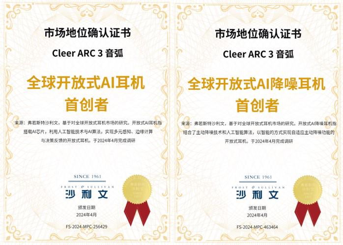 由于其在A(yíng)I技術(shù)和降噪技術(shù)方面的創(chuàng )新突破,Cleer ARC 3音弧 降噪版榮獲了沙利文頒發(fā)的《全球開(kāi)放式AI耳機首創(chuàng )者》和《全球開(kāi)放式AI降噪耳機首創(chuàng )者》兩項認證證書(shū),這不僅是對其技術(shù)創(chuàng )新的認可,也是對其在提升用戶(hù)體驗和安全性方面所做貢獻的肯定。