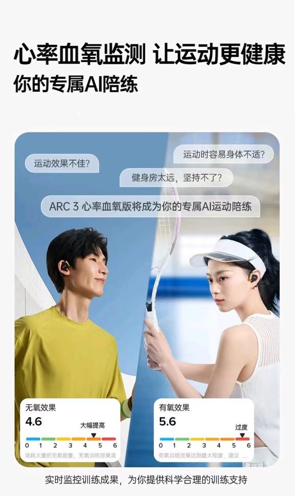 其次,ARC 3 音弧 運動(dòng)版Pro能讓運動(dòng)更科學(xué)、更高效。與其他開(kāi)放式運動(dòng)耳機不同的是,它不僅創(chuàng )新性地新增了心率血氧監測這一功能,更是搭配了一系列運動(dòng)健康服務(wù)。